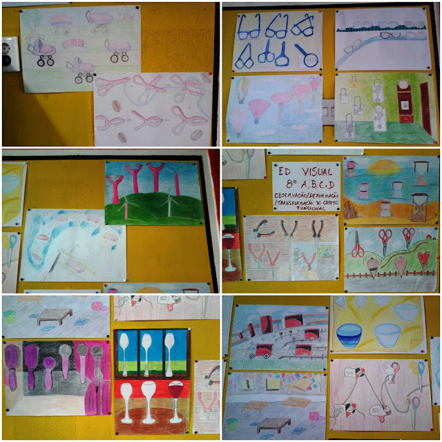 Quem vier à Biblioteca da Escola Básica de Azeitão vai passar por estes trabalhos. São exemplos da atividade desenvolvida por alunos de 8° ano, no âmbito de educação visual.