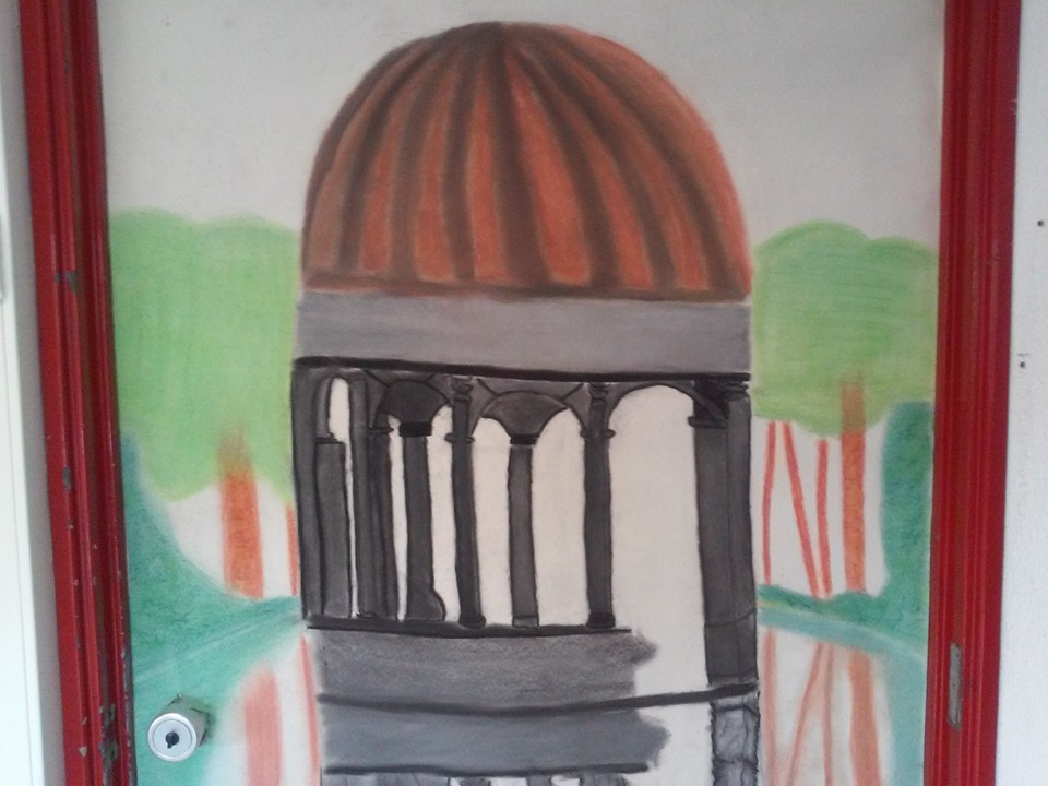 Algo que acabou de ser colocado: um painel com uma imagem da Quinta das Torres, que faz parte do património da região. Um trabalho de alunos de 9° ano. A Biblioteca da Escola Básica de Azeitão está cada vez mais bonita.