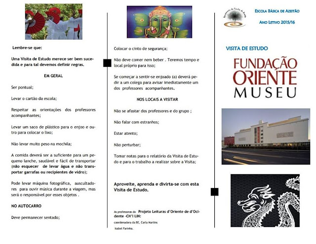 Esta tarde e a propósito da participação no projeto Leituras d'Oriente e d'Ocidente, as turmas 6ºE e 8ºD estiveram numa visita de estudo ao Museu do Oriente, em Lisboa. Deixamos aqui o folheto que foi preparado para o efeito.